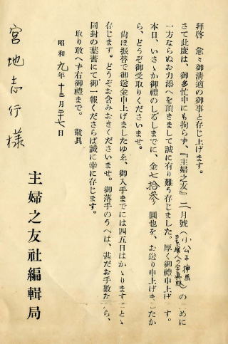 優良コドモエホンの裏表紙 “親御様方へ”という安倍季雄の添書がある。 近頃、芸術的教育や、情操教育の立場から、 一般識者の間に、絵の教育と言ふ事が やかましく論議され、留意されるやうに なつた事は、喜ぶべき事であります。 誰しも、美しい上品な絵を見て居ると、 自然心が美しく上品になつて参ります。 子供とても同じ事で、美しい絵、上品な 絵を見る事によつて、どれだけその品性が 美化されるか分りません。 それが即ち絵の教育です。 絵の力です。 決して絵そのものを教へるのでなく、 絵の力によつて子供を上品に、 美しく育てて行かうといふのが、絵の教育 の本音であります。 この『優良コドモヱホン』は、主として、 最も子供を知り、常に子供と共に生活し、 童画家として日頃私の最も尊敬して居る 宮地志行君の苦心の作になるもので、 内容といひ、色彩といひ、印刷といひ、 実に申分ない出来ばえであります。 どなたのご家庭でも、安心してお子様方に 御興へになれる優秀な絵本として、 推奨する所以であります。 優良コドモエホン(優良コドモヱホン) シリーズ ① 桃太郎(宮地志行) ② サルカニ合戦(宮地志行) ③ ヂャウチャン(長谷川露二) ④ イソップ(宮地志行) ⑤ 僕は軍人大すきよ(梁川剛一) ⑥ 青イ鳥(宮地志行) ⑦ 動物園(宮地志行) ⑧ ヨイコニナリマセウ(宮地志行) (⑥青イ鳥は欠品、 また③⑤は著者が異なる為に欠品) ![]() ![]() ![]() ![]() ![]() 以上四点は 化粧箱入りセット本として 販売されたもの。 表紙の絵は普及本と 異なるが内容は同じ 振替送金通知 主婦の友社 宮地志行宛 ![]() 主婦の友2月号 小公子挿画 日本婦人の写真版 の制作お礼として73円也 昭和9年(1934)12月27日 振出通知書 主婦の友社 宮地志行宛 ![]() 百円也 昭和10年(1935)4月27日 2025年現在価値20万円~50万円 |